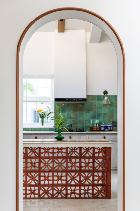 At the heart of the home is a central courtyard, where hand-laid bricks, patterned flooring, skylights, and earthy filler slab ceilings come together to create a space that feels both open and grounded. The open kitchen follows the same approach—white cabinetry and terracotta breeze blocks create a clean yet textured space, brought to life by artwork and indoor plants.
